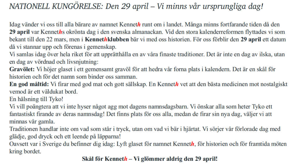 - Kungabrevet. Inför KennethDagen 22 mars skickar Svenska KennethKlubben ett brev till Kungen, Riksdagen, Regeringen, Talmannen mfl. betydande myndigheter, där vi påtalar vikten av att den 22 mars KennethDagen blir en nationell helgdag och flaggdag. Så att hela svenska folket kan vara med och fira den högtidsdag.