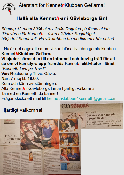 - Kennethdagen den 22 mars – med årsmöte, festligheter och utnämningen av Årets Kenneth.